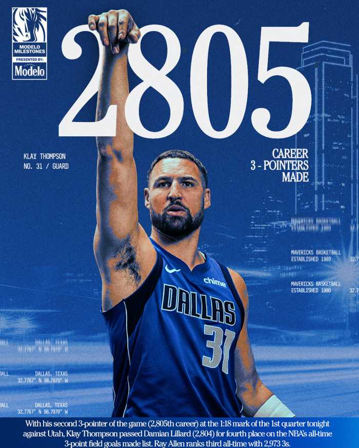 北京时间1月16日,独行侠替补克莱-汤普森完成了职业生涯2805+三分超越达米安-利拉德升至历史第四位,在他身前只剩下库里、哈登、雷阿伦,而且这场比赛独行侠144-123狂胜爵士,克莱的里程碑之夜非常耀眼。