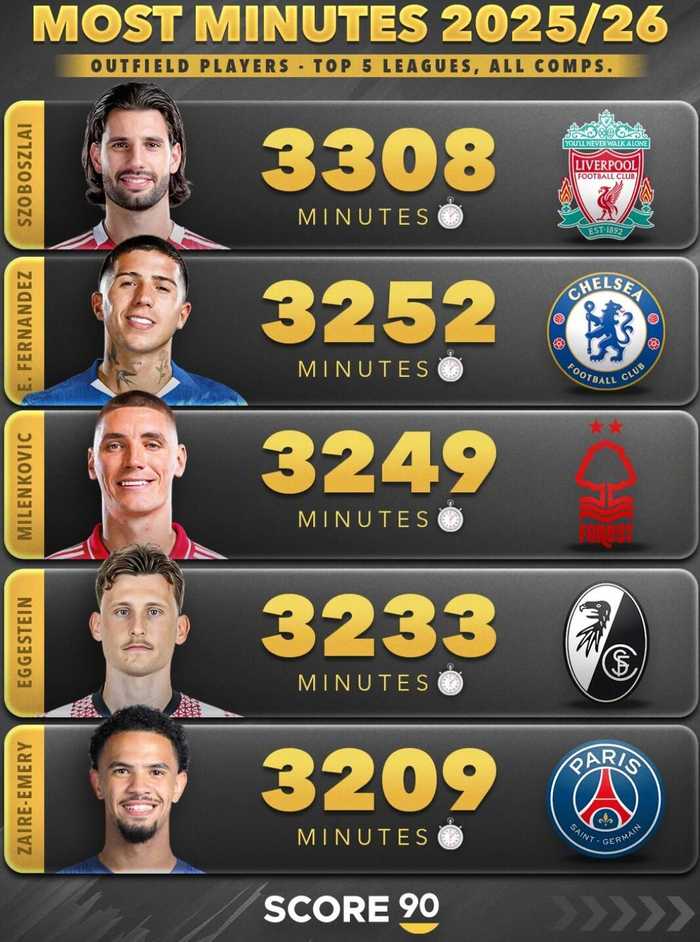 随着2025/26赛季五大联赛进入高潮,SCORE90统计了五大联赛“出场时间最多”的非门将球员榜单。前十名如下: