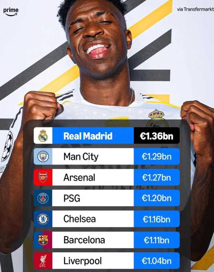 Prime盘点了世界足坛目前七家球员总身价突破10亿欧元的俱乐部,详情如下: