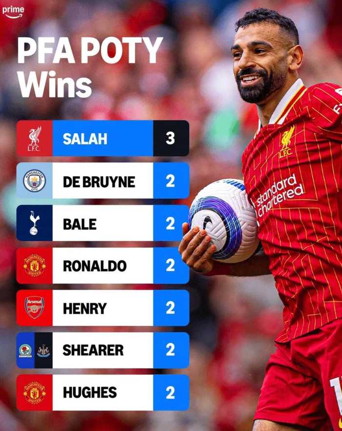 萨拉赫此前曾在2018年和2022年也曾获得该奖项,德布劳内、贝尔、C罗、亨利、希勒和马克-休斯,都曾2次获奖,而萨拉赫以3次独占第一。
